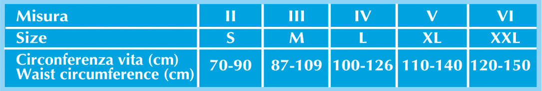 Cinture elastiche in speciale tessuto traspirante millerighe completamente foderate in puro cotone elasticizzato, dotate di un’ampia zona adesiva che assicura una perfetta regolabilità e vestibilità.