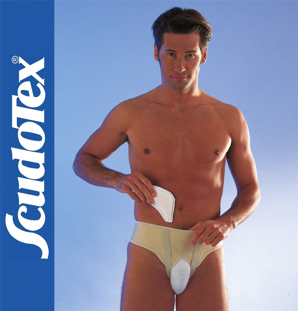 Cinto erniario inguinale regolabile con anatomico davantino protettivo in resistente ed igienico cotone elasticizzato, corredato di sottocoscia e due pelotte in gomma foderate in cotone.