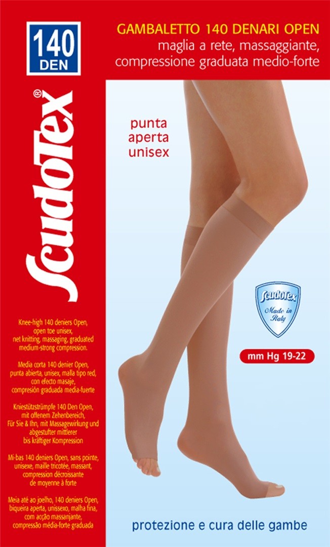 Gambaletto 140 denari punta aperta maglia a rete, compressione medio-forte (mm Hg 19-22) unisex, con bordo equilibratamente elasticizzato che sostiene senza stringere.