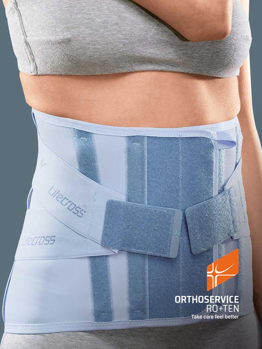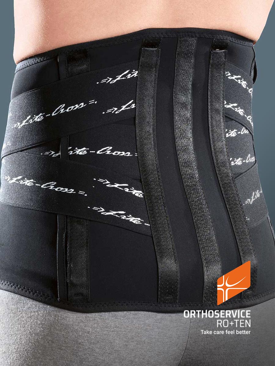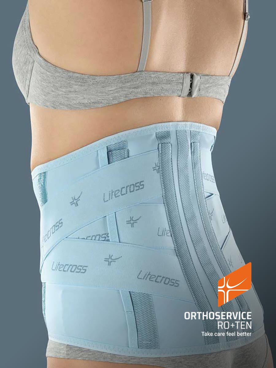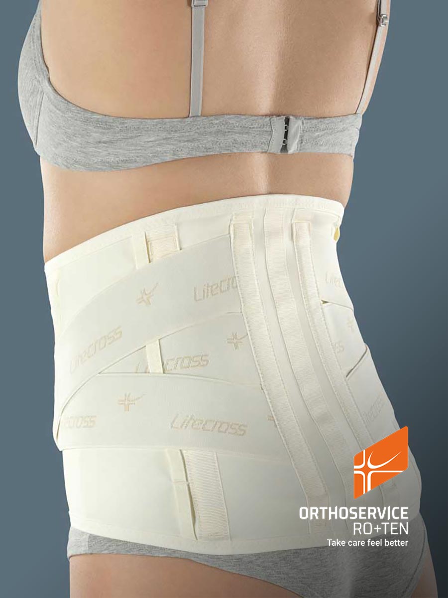 Busto ortopedico elastico basso per la stabilizzazione e lo scarico del rachide lombare, con pelotte rigide termoformabili