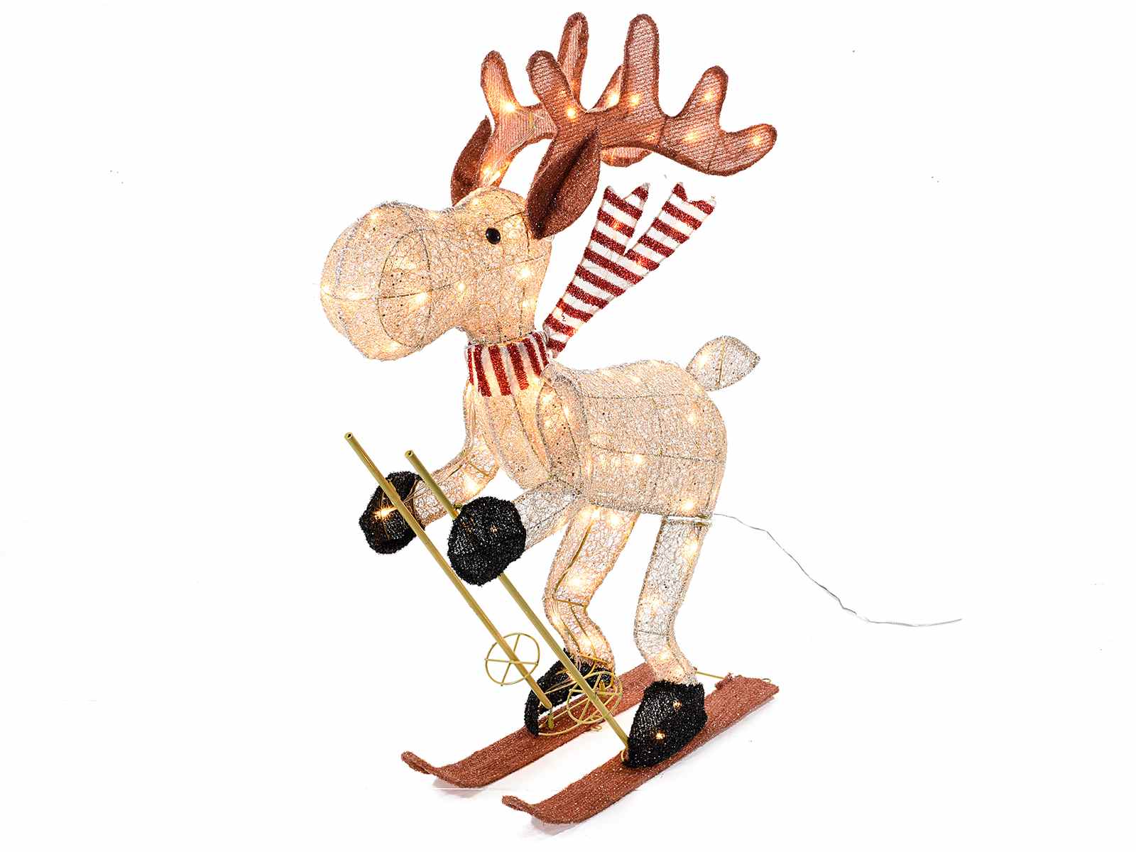 Renne sugli sci con anima in metallo e luci LED. Decoro luminoso per allestire vetrine di Natale e decorare allestimenti e luminarie festive.