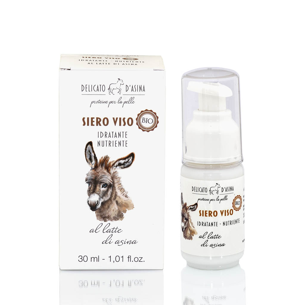 Il Siero Viso BIOLOGICO al Latte di Asina è un fluido ricco di principi attivi naturali ideale per tutti i tipi di pelle. L’azione idratante e nutriente del Latte di Asina* e dell’Acido Ialuronico è potenziata dall’aggiunta di Olio di Argan* e di Vitamina E con proprietà antiossidanti. Non unge e si assorbe rapidamente. Arricchito con Estratto di Camomilla*.